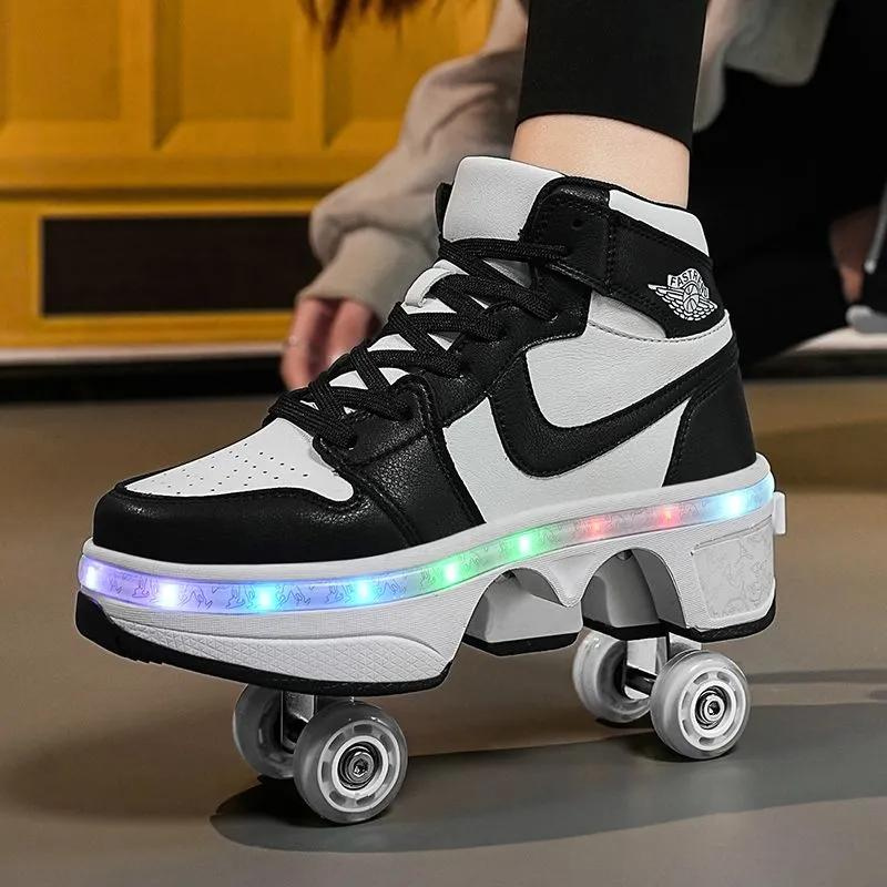 Transform your walk into a skate with one touch! Discover the ultimate fusion of style and functionality with our roller skate shoes, the perfect blend of sneakers and skates. The innovative design features a simple touch button that seamlessly transitions from stylish sneakers to thrilling skates, ensuring you savor every step of your journey. The secure lock/unlock mechanism guarantees the wheels remain tucked in until you’re ready to skate, preventing any accidental deployments. Effortlessly transform these shoes with wheels into sleek sports shoes for a comfortable walking experience. Ready to glide? Just press, lock, and skate away. Say goodbye to carrying extra footwear – our versatile roller skate shoes have you covered for every adventure!